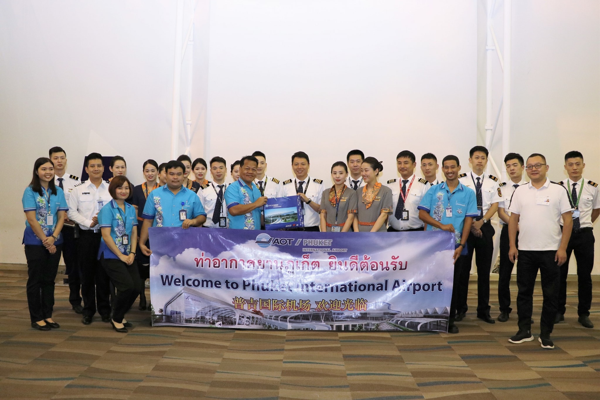 วันที่ 11 ก.ค.62 เวลา 04.30 น. นายสมศักดิ์ ภักดีรักษ์ ผอก.ฝอต.ทภก. และพนักงานลูกจ้าง ทภก. ให้การต้อนรับพร้อมมอบของที่ระลึกให้กับผู้โดยสารนักบินและลูกเรือเที่ยวบินปฐมฤกษ์สายการบิน Qingdao Airline เที่ยวบินที่ QW9899 เส้นทางการบิน TAO (ชิงเต่า) - HKT (ภูเก็ต) มีผู้โดยสารจำนวน 168 คน นักบินและลูกเรือ 19 คน ณ ประตูหมายเลข 15 (Bus Gate 15) อาคารผู้โดยสารระหว่างประเทศ ทภก.